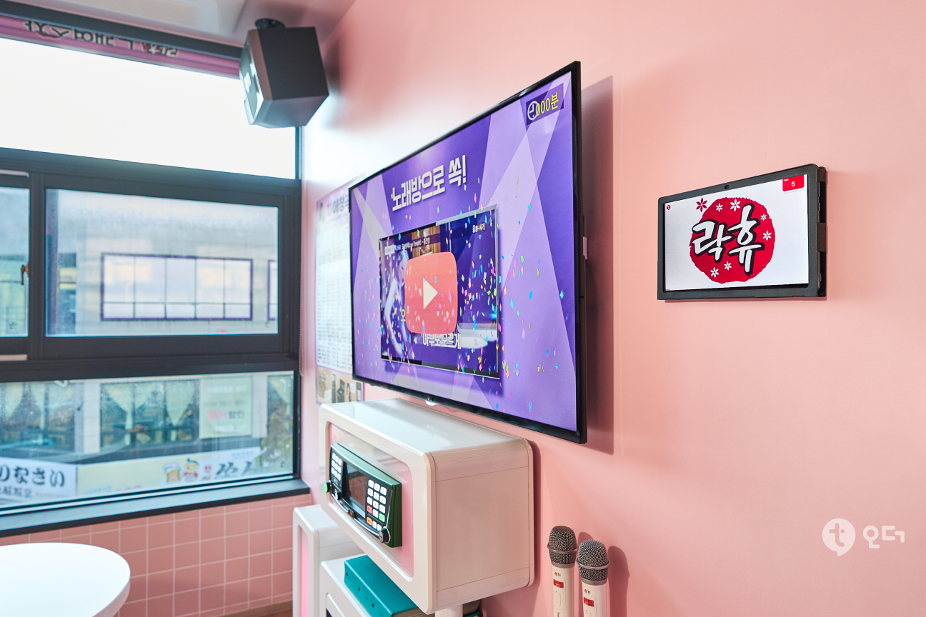 밤 10시, 청소년 이용 가능 시간 이후 락휴 노래연습장은 성인을 대상으로 운영됩니다. 노래를 부르며 가볍에 마실 수 있는 생수나 탄산음료 등은 낮 시간 청소년들도 주문할 수 있지만 주류와 안줏거리는 저녁 시간 성인을 대상으로만 판매하고 있습니다. 손님들이 룸에서 나오지 않고 손쉽게 주문할 수 있도록 각 룸 TV 옆에는 벽걸이형 거치대를 이용한 티오더가 설치돼 있습니다.